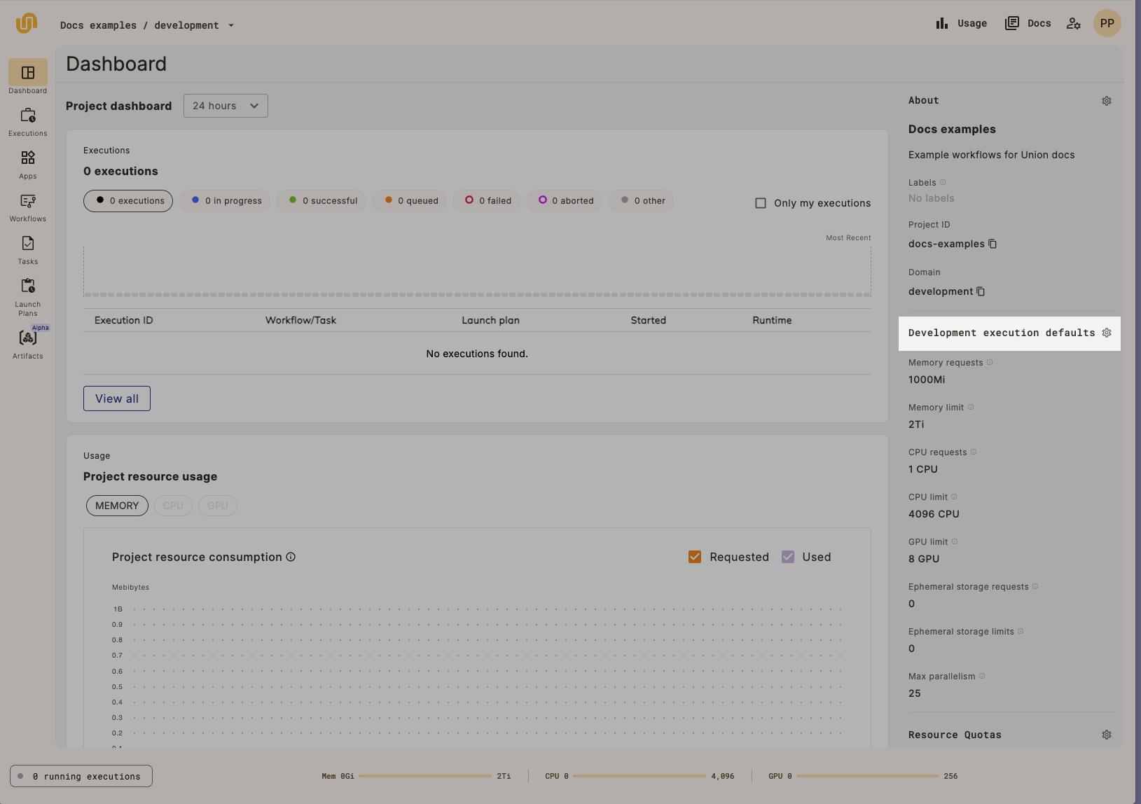 The execution defaults and resource quotas can be found on the right sidebar of the Dashboard. They can be edited by selecting the gear icon:
