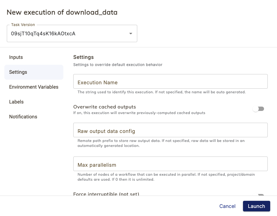 • Force interruptible: A three valued setting for overriding the interruptible setting of the workflow for this particular execution. If not set, the workflow’s interruptible setting is used. If set and enabled then interruptible=True is used for this execution. If set and disabled then interruptible=False is used for this execution. See Interruptible instances